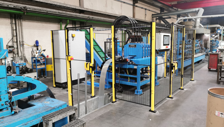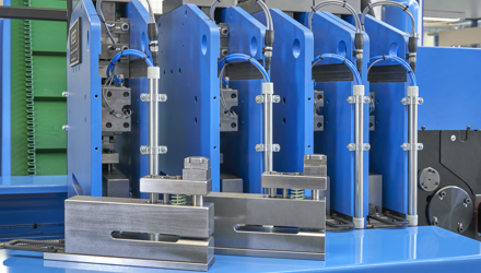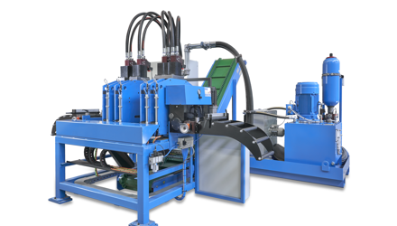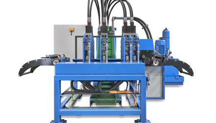 Hydraulische ponsmachine voor het ponsen van een gatenpatroon in vlakke band t.b.v. kokerrolvormproductie. De machine is uitgevoerd met een 4-tal hydraulische persen, elk met een capaciteit van 120KN. Alle persen zijn onafhankelijk in te stellen op de x-as m.b.v. Servo gestuurde aandrijving. Persen zijn uitgevoerd met 2 speciale ponsbeugels die beide onafhankelijk zijn in te stellen op de Y-as m.b.v. Servo gestuurde aandrijving. Servo aangestuurde hydrauliek cilinders met een persslag van 0.5 seconde.