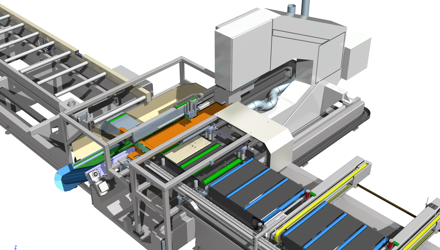 Na het invoeren wordt het paneel door middel van een opduwer doorgevoerd voor een juiste maatvoering. Afvalstukken worden zijdelings uit- en afgevoerd.