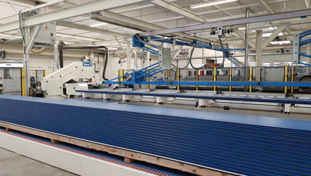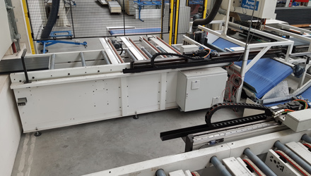 Robuuste lintzaagopstelling voor het verwerken van sandwichpanelen ten behoeve van garagedeuren. Voorzien van besturing om de panelen geautomatiseerd door te voeren. Weber heeft deze zaag geïntegreerd in een complete productielijn.